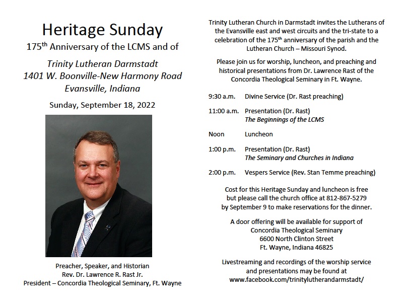 September 18 – Heritage Sunday with President Lawrence Rast of Ft. Wayne Seminary