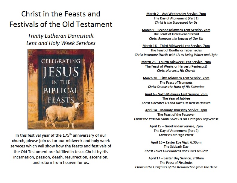 March 2 – Ash Wednesday at 7pm begins Lent season (Christ in the Festivals of the Old Testament)